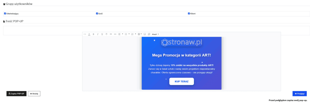 - Kontrolowanie częstotliwości wyświetlania: Możliwość ustawienia, czy pop-up ma być wyświetlany tylko raz, raz na dzień, raz na tydzień, raz na miesiąc (cookie).
