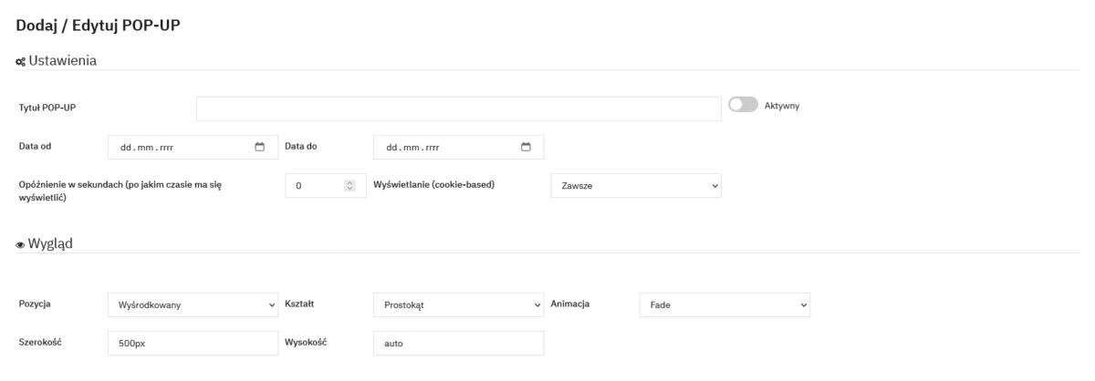 - Personalizacja wyglądu: Określenie kształtu pop-upu (prostokąt, okrąg, zaokrąglony), szerokości oraz wysokości, co pozwala na dostosowanie do identyfikacji wizualnej sklepu.